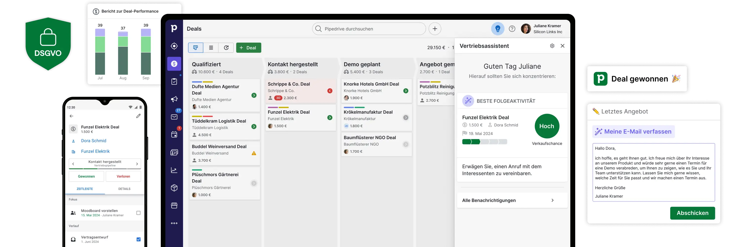 - KI-Berichte & Analysen: Erhalte in Echtzeit datengestützte Vorschläge zur Optimierung deiner Vertriebsaktivitäten