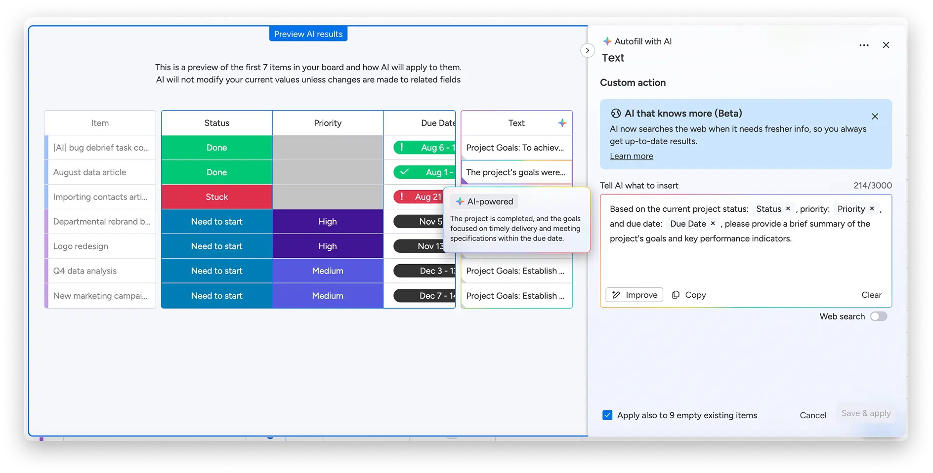 Autofill unterstützt gängige Spaltentypen wie Text, Status, Dropdown, Zahl, Datum oder Personen. So kannst du etwa Freitext automatisch zu Labels zuordnen, Felder befüllen oder Notizen in kurze Bullet Points umwandeln.