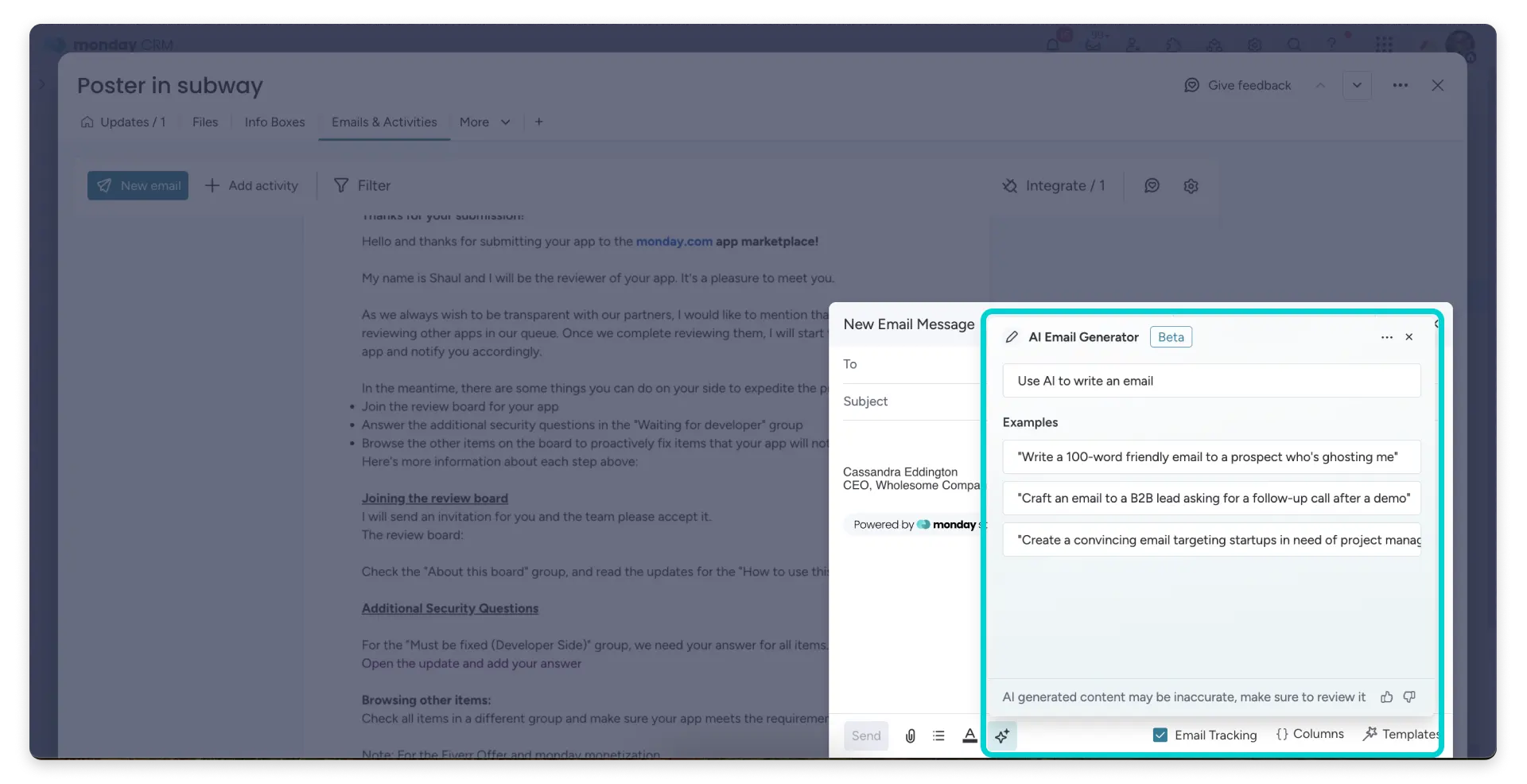 In monday CRM nimmt dir KI gleich mehrere Schritte ab: In Emails & Activities bekommst du passende Vorschläge für Betreff und Mailtext, die du mit einem Klick übernimmst und bei Bedarf anpasst. Die AI Timeline Summary verdichtet alle Interaktionen mit Leads oder Kund:innen zu einer kompakten Zusammenfassung. Auf deinen CRM-Boards nutzt du Autofill mit KI, um Spalten automatisch zu befüllen: Texte verbessern oder zusammenfassen, Informationen aus Freitext extrahieren, übersetzen und Werte direkt in die Felder schreiben.