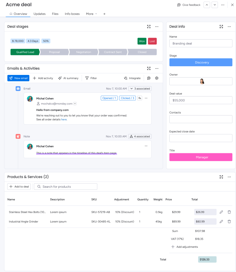- Products & services stay in sync e.g. between monday CRM and QuickBooks, ERP or other systems