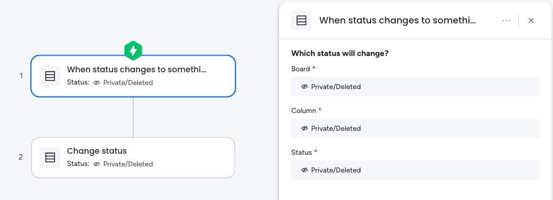 - Data protection-friendly visibility: If a workflow contains inaccessible or deleted boards or columns, these are clearly marked as “Private” or “Deleted.” This ensures that you can only see what you actually have permission to do.